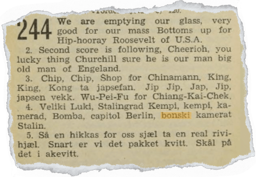 Begrepet Bonski/Bånnski er en typisk slang fra andre verdenskrig og tidlig etterkrigstid. Uttrykket ble blant annet brukt i denne drikkesangen fra krigen: